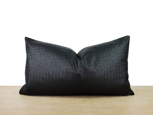 Black Woven Embossed Faux Leather Front Pillow Cover